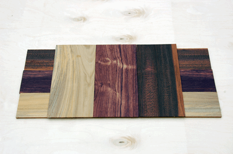 Finger boards and peg head overlays re-sawn and thickness sanded. Vera wood, Honduran rosewood, and snake wood, left to right and bottom to top.