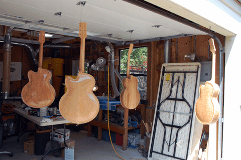 Four guitars being finished.