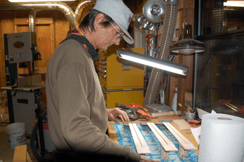 Master luthier Patrick McCarthy volunteers. He is doing some final shaping of the recurve.