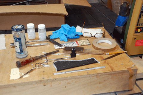 Michael checking final neck shape while Patrick prepares to assemble a completed neck to a body.