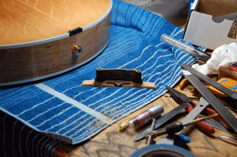 Bridge feet have been fit to the top. Now the nut can be completed, and then the bridge saddle and tail piece saddle can be adjusted.