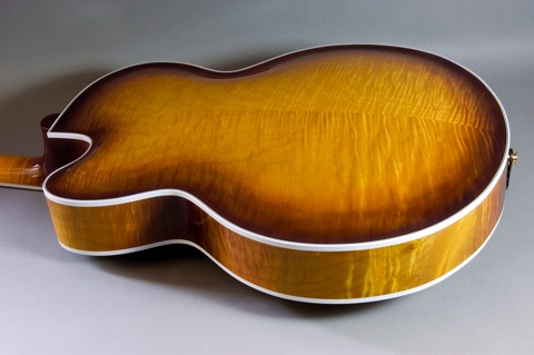 Pannonica 17” (#8) is a full size hollow body arch top designed for playing amplified. The top is about 0.5 mm thicker than a completely acoustic guitar, and the body depth is 1/8” thinner, at 2 and 7/8”; these two modifications make the guitar less likely to feed back, and increase sustain, at the expense of some acoustic volume. The top has a cavity routed for any pickup in the standard Gibson Humbucker size and shape. Currently, a Q-Tuner GL-6 is mounted. There is a single control, a 1 MegOhm volume pot. The price is $8000.